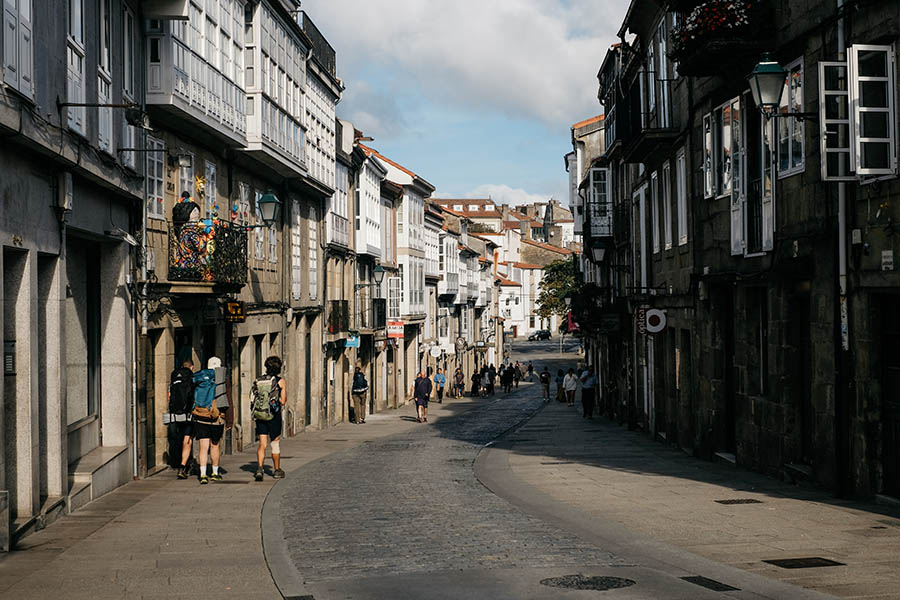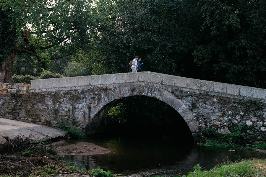 La Galice affiche dans l’assiette sa celtitude, si surprenante sous ces latitudes, que l’on retrouve aussi dans les paysages. Dans cette région bordée par la côte Atlantique, la bruyère et les hortensias apportent leur touche colorée, tandis que l’ambiance brumeuse dans une forêt de chênes verts évoque Brocéliande et ses légendes… Une musique techno nous tire de notre rêverie : un groupe d’étudiants vêtus de noirs déboulent enceinte à l’épaule. Le premier réflexe est de bougonner, avant de leur adresser un sourire. Ce mélange de générations apporte de la gaité sur un tronçon millénaire resté bien vivant.