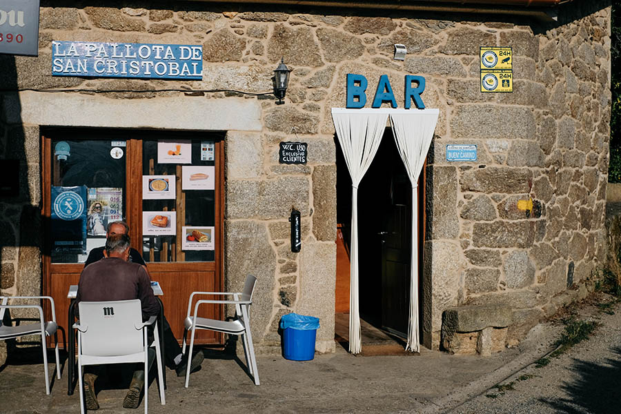 Comme sur une autoroute, des albergues se succèdent régulièrement pour recharger ses batteries, à coup de caféine ou d’eau fraîche. À la sortie du village de Gonzar, un grand panneau lumineux clignote, « abierto » en lettres bleues, « open » en lettres rouges, devant une bâtisse aux airs de Bagdad Café perdu dans la pampa. Des dahlias sauvages, blancs ou couleur framboise, poussent entre les rochers, bouquets naturels que l’on imaginerait bien dans un vase chez soi.