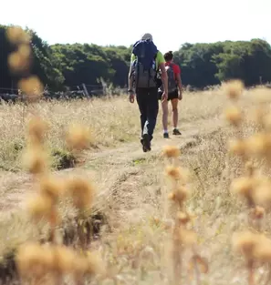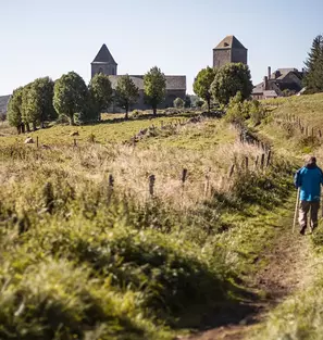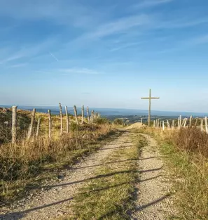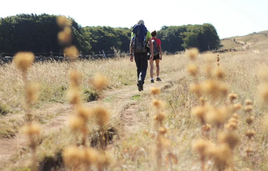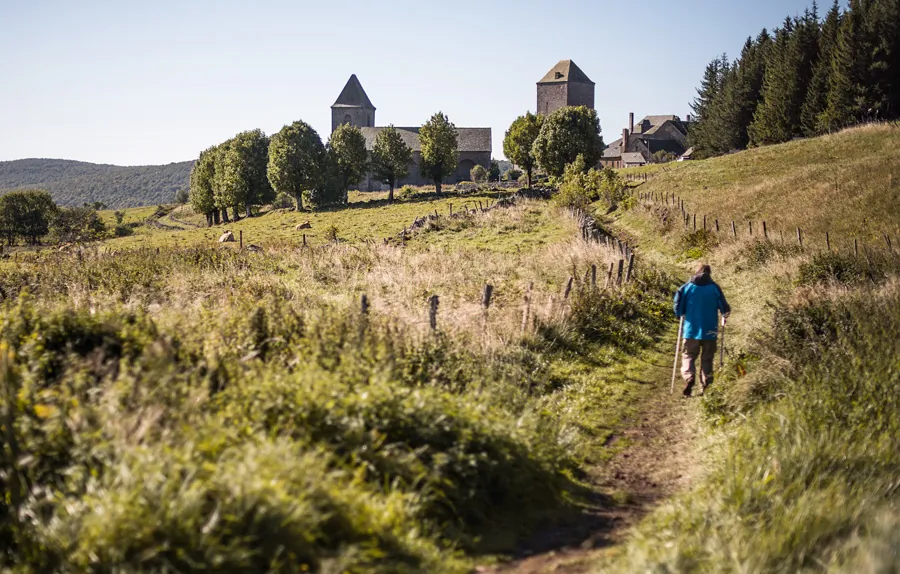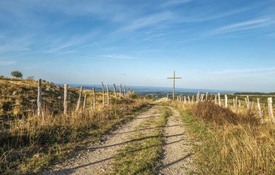 Depuis Aumont-Aubrac, en « Terre de Peyre », comprendre terre de pierre, le chemin de Compostelle traverse de jolis bosquets de pins avant de rejoindre les immensités de l'Aubrac tapissées de pâturages à perte de vue et ponctuées de burons. Ces terres sont le pays du célèbre couteau de Laguiole, instrument indispensable pour couper le fromage du même nom.