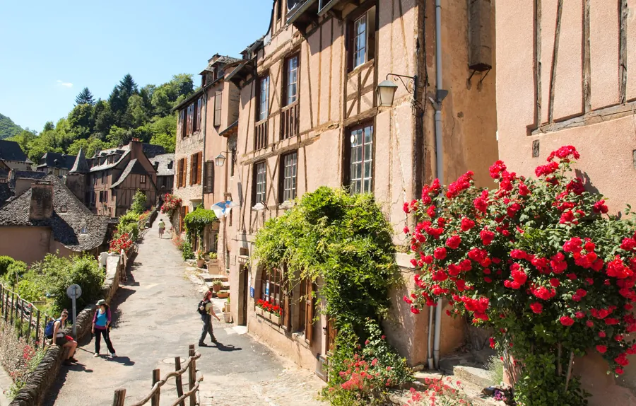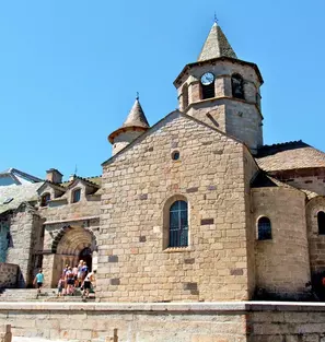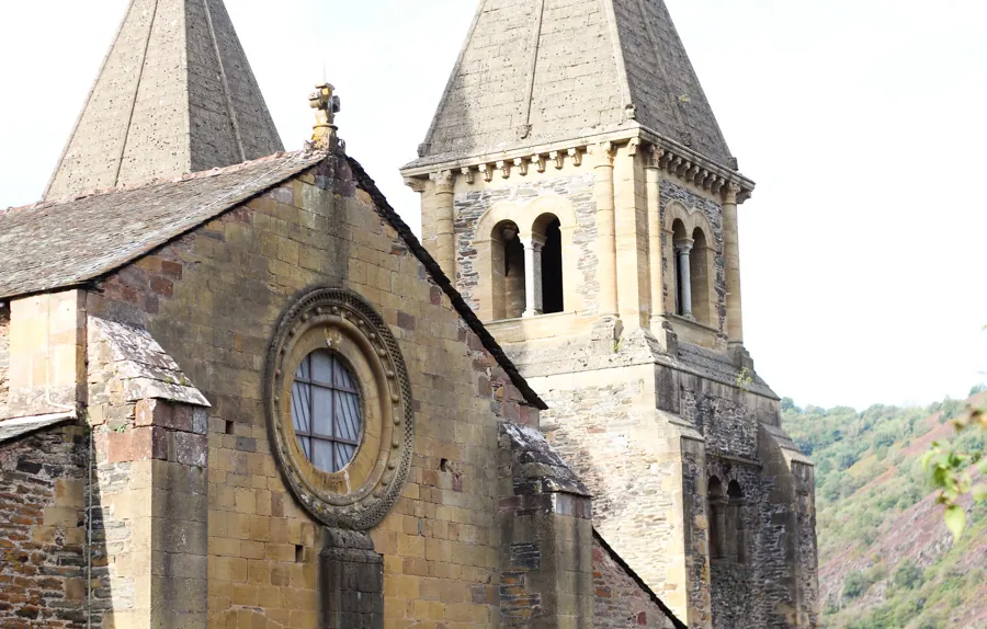 Découverte d'Espeyrac où la légende prétend qu'en 960, un pèlerin rendu aveugle suite à une agression, retrouva la vue en invoquant la patronne de Conques. Descente par la combe encaissée de l'Ouche, arrivée sur le Dourdou (qui se jette un peu au nord dans le Lot) et découverte de Conques, bourg aux toits pointus d'où surgissent les trois tours de l'abbatiale romane Sainte-Foy, joyau de l'architecture médiévale, classée Patrimoine Mondial par l'UNESCO, et de son pont des pèlerins qui permet de franchir le Dourdou.