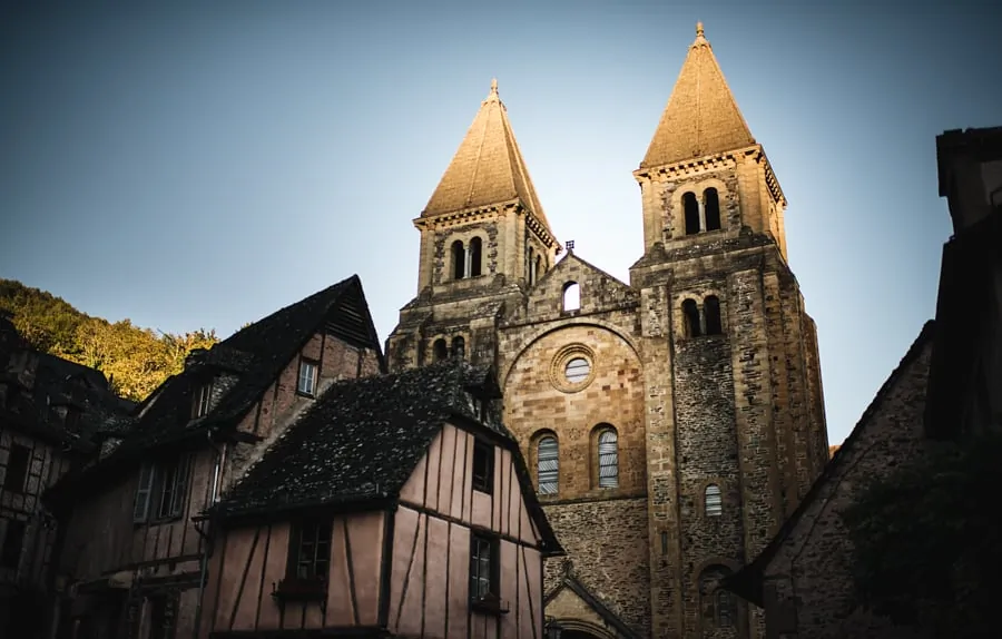 L'Arrivée au village de Conques, classé « Plus beaux villages de France » et son abbaye classée au patrimoine mondial de l'UNESCO