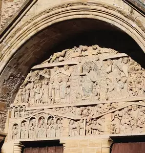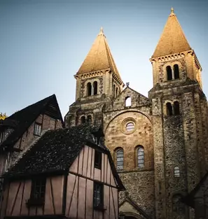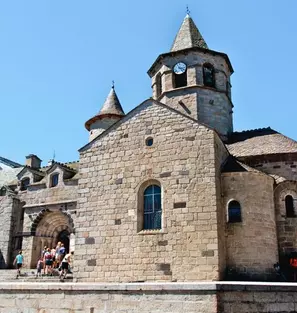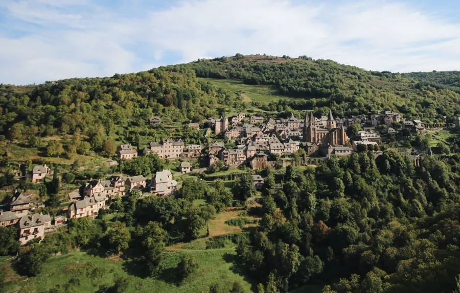Découverte d'Espeyrac où la légende prétend qu'en 960, un pèlerin rendu aveugle suite à une agression, retrouva la vue en invoquant la patronne de Conques. Descente par la combe encaissée de l'Ouche, arrivée sur le Dourdou (qui se jette un peu au nord dans le Lot) et découverte de Conques, bourg aux toits pointus d'où surgissent les trois tours de l'abbatiale romane Sainte-Foy, joyau de l'architecture médiévale, classée Patrimoine Mondial par l'UNESCO, et de son pont des pèlerins qui permet de franchir le Dourdou.