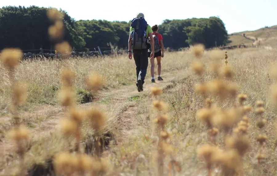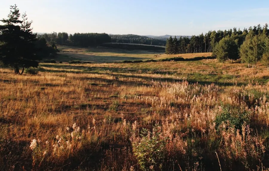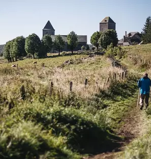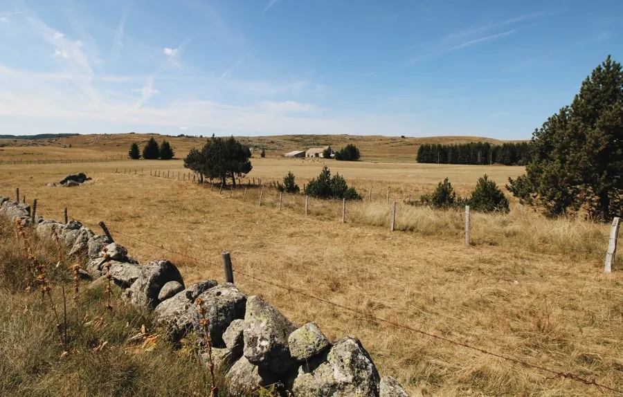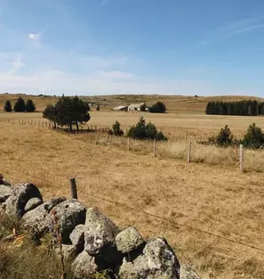 Depuis Aumont-Aubrac, en « Terre de Peyre », comprendre terre de pierre, le chemin de Compostelle traverse de jolis bosquets de pins avant de rejoindre les immensités de l'Aubrac tapissées de pâturages à perte de vue et ponctuées de burons. Ces terres sont le pays du célèbre couteau de Laguiole, instrument indispensable pour couper le fromage du même nom.