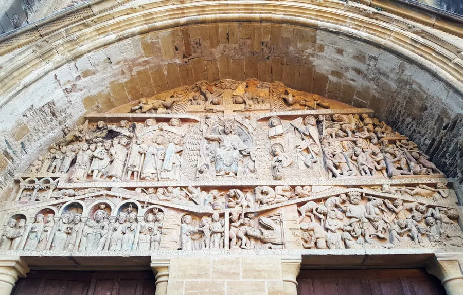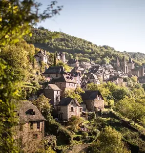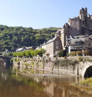 Ultime étape pour rejoindre Conques qui fait souvent partie des coups de cœur du pèlerin. Descente par la combe encaissée de l'Ouche et arrivée sur le Dourdou. Découverte de Conques, bourg aux toits pointus d'où surgissent les trois tours de l'abbatiale romane Sainte-Foy, joyau de l'architecture médiévale, classée Patrimoine Mondial par l'UNESCO, et de son pont des pèlerins qui permet de franchir le Dourdou. En chemin, à Espeyrac, la légende prétend qu'en 960, un pèlerin rendu aveugle suite à une agression, retrouva la vue en invoquant la patronne de Conques. Fin du programme et de nos prestations dans l'après-midi à Conques.