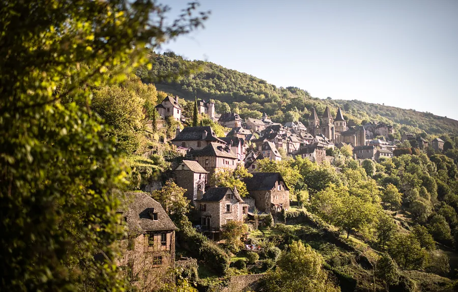 L'Arrivée au village de Conques, classé « Plus beaux villages de France » et son abbaye classée au patrimoine mondial de l'UNESCO