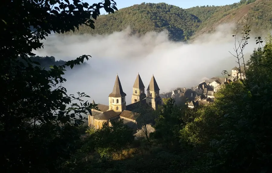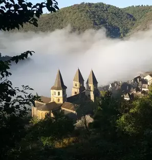 Découverte de Saint-Côme-d'Olt classé parmi les plus beaux villages de France, puis transfert en direction d'Estaing pour visiter ce joli village classé "Plus Beaux Villages de France". Transfert pour débuter la randonnée depuis Sénergues jusqu'à Conques, qui fait souvent partie des coups de cœur du pèlerin. La vue sur ce village est saisissante pour qui vient de l'est. En descendant dans la combe encaissée de l'Ouche, arrivée sur le Dourdou (qui se jette un peu au nord dans le Lot) et découverte de ce bourg aux toits pointus qui domine les trois tours de la basilique Sainte-Foy. Nuit à Grand Vabre au bord du Dourdou à proximité de Conques.