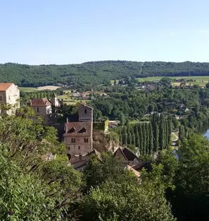 Traversée du Lot à Bouziès sur le pont suspendu pour poursuivre sur le chemin de halage taillé dans le rocher. Visite de Saint-Cirq-Lapopie, village médiéval perché sur son éperon rocheux qui surplombe le Lot.