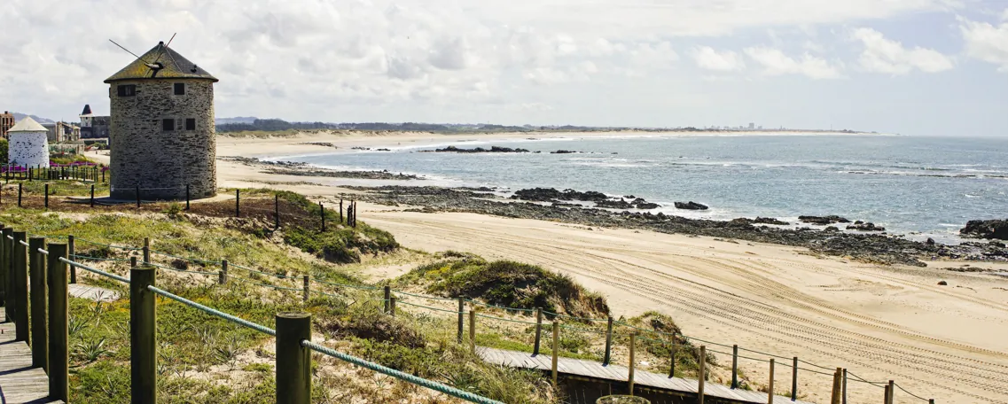 Poursuite sur la via littorale le long de l'océan entre anciens moulins à vent, côte rocheuse, plages et dunes. Une portion de route permet de rejoindre le rio Ancora que l'on traverse pour atteindre la discrète station balnéaire de Vila Praia de Ancora.