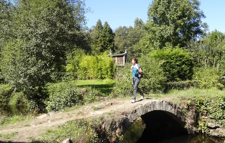 Sortie de Lugo par la porte Saint Jacques et le pont romain. Le chemin vous emmènera très rapidement dans la campagne galicienne. Vous retrouverez les chemins bordés de murets, les horreos, et parfois la calzada. Un petit détour par Santa Eulalia de Boveda vous permettra de découvrir, outre l'agréable hameau et ses habitats traditionnels en granit, la magnifique chapelle paléochrétienne qui gît sous l'église paroissiale. En ce jour 11, c'est à Ferreira que vous passerez la nuit.