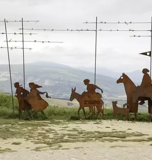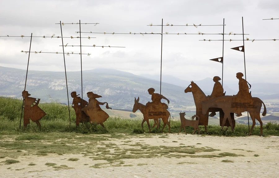 À peine quitté les derniers faubourgs de Pamplona, on aperçoit la Sierra del Perdón facilement identifiable aux éoliennes qui épousent sa crête. En la franchissant, on pourra découvrir les sculptures en métal immortalisant les pèlerins se dirigeant vers Saint-Jacques, mais aussi jeter un dernier regard vers la chaîne des Pyrénées si majestueuse par beau temps. La deuxième partie du parcours est consacrée à la longue descente vers Puente la Reina, point de rencontre entre le Camino Aragonès et le Camino Francés.