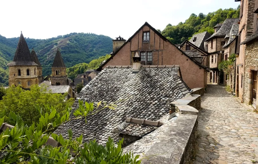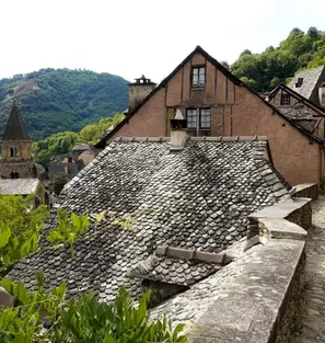 Découverte de la vallée du Lot et arrivée dans le joli village d'Estaing. Étape aveyronnaise très vallonnée sauf si l'on suit les gorges du Lot par Entraygues-sur-Truyère et Vieillevie, la difficulté du jour sera alors la remontée du vallon du Dourdou jusqu'à Conques. Dans ce bourg les toits sont pointus et dominent les trois tours de la basilique Sainte-Foy où il est également possible d'admirer son portail, véritable trésor de style roman.